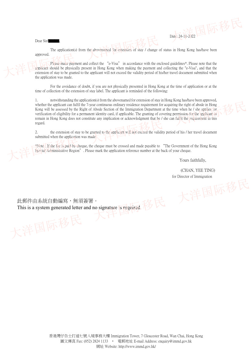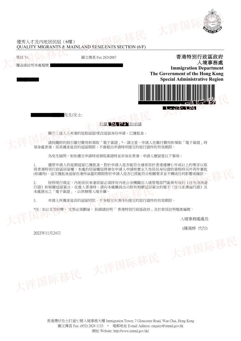 恭喜H先生通過香港簽證續簽!由大洋國際移民www.sweetybb.com首發,轉載請注明出處。