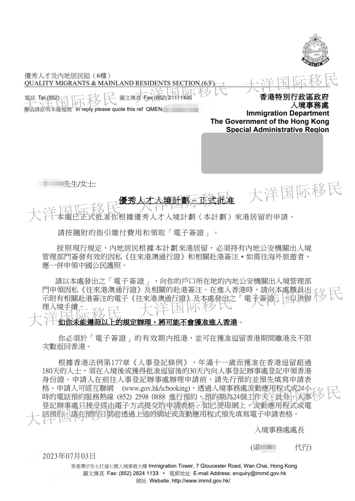 香港移民地更多詳情歡迎致電:400-999-3586. 恭喜Z先生成功獲批香港優才計劃!由大洋國際移民www.sweetybb.com首發,轉載請注明出處。