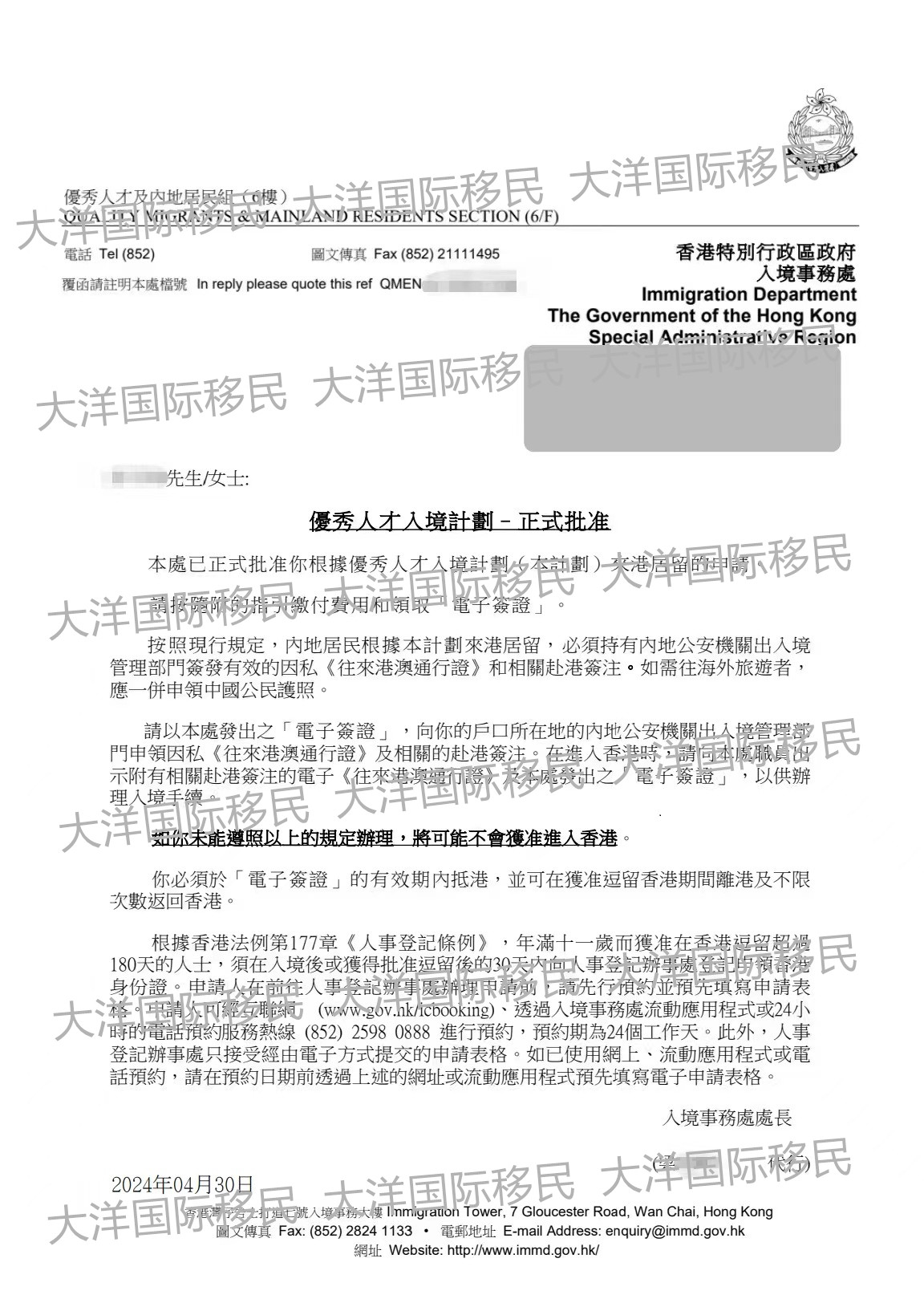 恭喜A先生成功獲批香港優才計劃!由大洋國際移民www.sweetybb.com首發,轉載請注明出處。