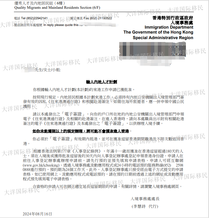 L女士,非名校畢業,小眾傳統行業,考慮今后發展,想辦理香港移民。我們于2024年8月16日為L女士成功獲批香港專才移民,恭喜L女士!