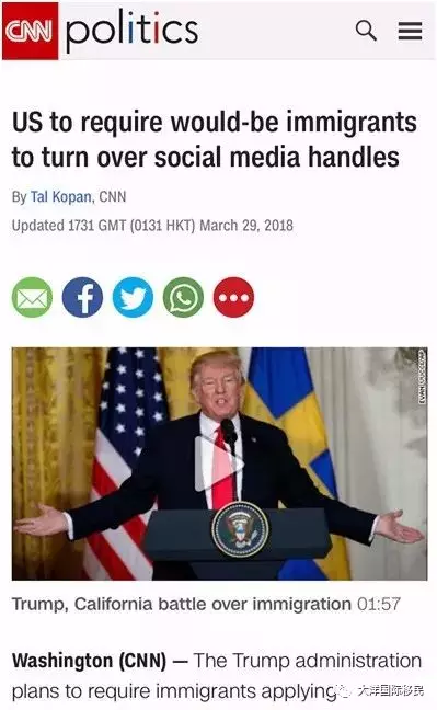 3月29日,周四,CNN報道,川普政府將于周五(3月30日)正式對外公布:加大赴美簽證審查的一項措施,計劃要求赴美簽證申請人提交過去五年的社交媒體賬號。