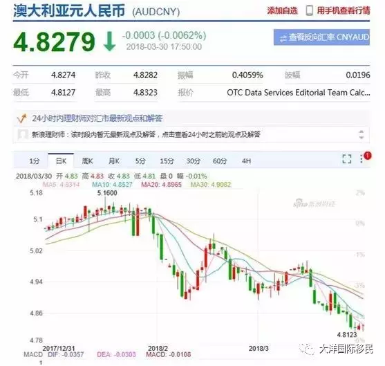 澳元兌人民幣的匯率出現了自2016年6月,20個月以來的最大跌幅。截止到3月30日,澳元兌人民幣1:4.8279。
