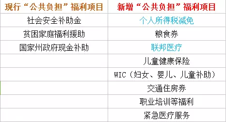 根據美國的《移民法》規定:會造成“公共負擔”的外國人,不僅無法取得綠卡,同時也會被遞解出境。根據美國政府1999年頒布的指導方針,公共負擔主要指通過直接現金補助或依賴政府資助的長期照護,排除非現金福利,包括政府提供的糧食補助(食物券)計劃或學前教育計劃等。