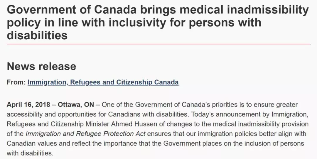 本周一(4月16日),加拿大移民部長胡森(Ahmed Hussen)宣布,對移民申請人體檢要求作出修改,今后,智力發育延緩、需要特殊教育服務、聽力或視力障礙的移民申請人,將不再被拒絕移民。也就是說,加拿大政府放寬了移民體檢要求,對帶有缺陷的或障礙的申請人將更加包容和開放!