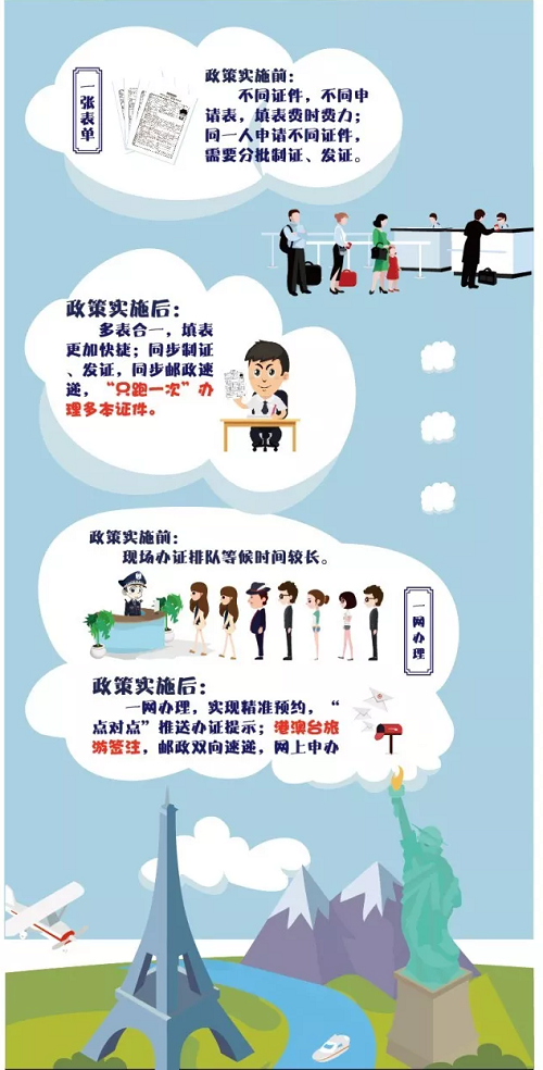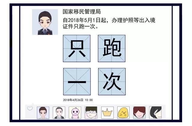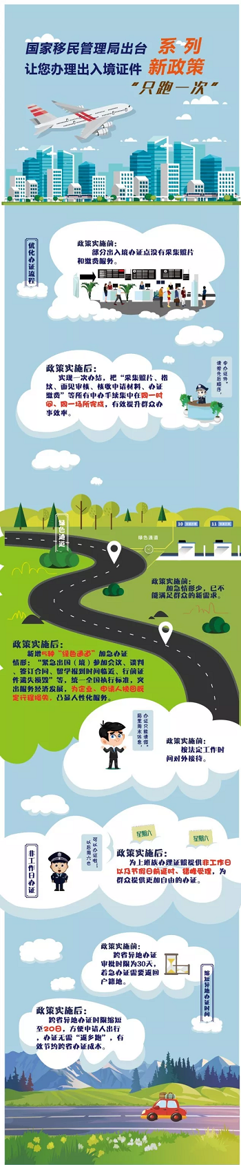 為認真貫徹落實黨中央關于加強改革移民出入境管理部署要求,不斷加強和優化服務管理廣大出入境人員的工作職能,不斷滿足人民群眾的新期待,國家移民管理局決定,自今年5月1日起,在全國實行辦理護照等出入境證件“只跑一次”制度。通過優化流程、簡化手續、運用新科技,提高辦事辦證效率,方便申請人辦事辦證,減輕群眾負擔,不斷提升服務管理水平,確保申請人到出入境接待窗口,一次即可完成申辦護照等出入境證件的全部手續,切實增加群眾的獲得感和幸福感。