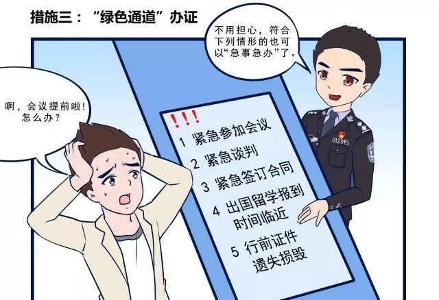 2、“綠色通道”辦證,增加緊急辦證事項范圍,為緊急出國出境參加會議和談判、簽訂合同以及出國留學報到時間臨近、行前證件遺失損毀等情況的人員提供“說走就走”的加急辦證服務;