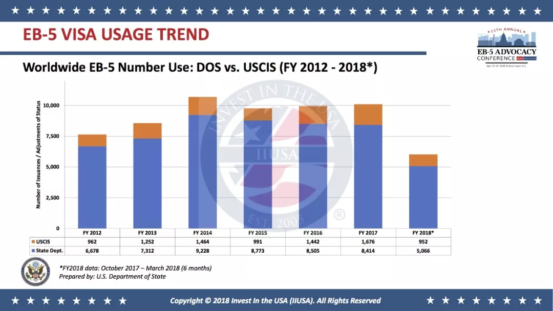 * 2018財年的上半年,通過簽證中心在各國領事館發放5,066張,通過移民局給在美國本土遞交I-485轉換身份者發放952張(大約占比16%)。
