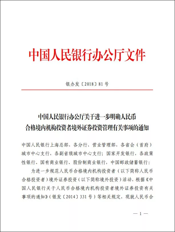 近日,中國人民銀行網站發布通知,《中國人民銀行辦公廳關于進一步明確人民幣合格境內機構投資者境外證券投資管理有關事項的通知》(《通知》)