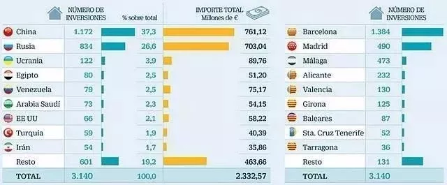 截至2017年年底,持黃金簽證進入西班牙各國人士投資一覽表