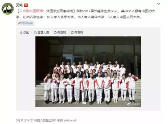 我校2017屆外籍學生共36人,其中35人報考中國的大學, 在35名學生中:16人考入北京大學,16人考入清華大學,3人考入中國人民大學。三所名校錄取率達100%。來看看下面這張畢業照,外國學生卻長著中國臉的孩子,難道都是天才?天才都去一個班了?其實,玄機在于他們的身份,他們都是外籍孩子。一個外籍身份就可以輕松進入中國孩子們夢寐以求的頂尖名校,把中國籍的孩子們,狠狠摁在了起跑線上!