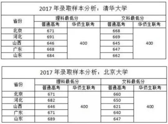 根據上表顯示,沒錯,400分確實可以上清華!但前提是華僑生,也就是說考生需要有個外籍身份。否則,就算是北京考生,想要上清華、北大,也要671分。其他省市的考生就更不用說了,錄取分數只會比北京考生更高。