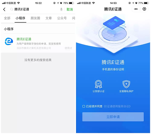 微信小程序頁(yè)面中搜【騰訊E證通】
