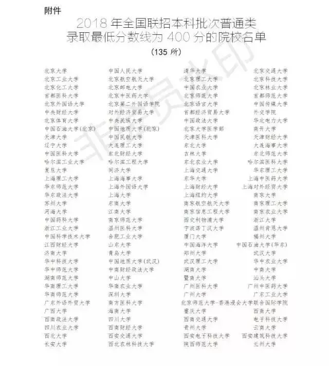 (一)普通類院校(專業)文史、理工類:300分(其中,原第一批本科錄取院校400分,院校名單見附件);