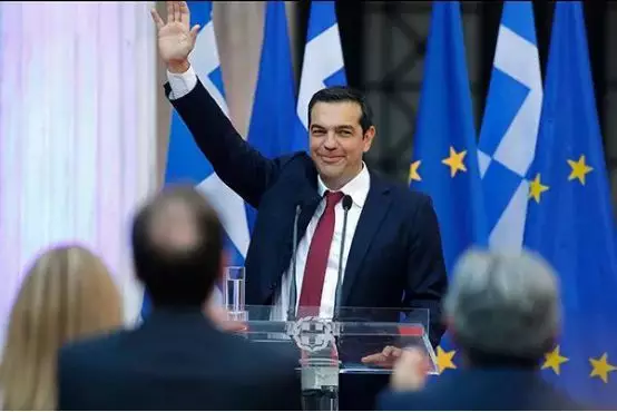 曾許諾債務危機一天不解除就一天不打領帶的希臘總理齊普拉斯,在22日傍晚舉行的慶祝活動上打上了酒紅色領帶參加在雅典扎皮宮舉行的慶祝活動。