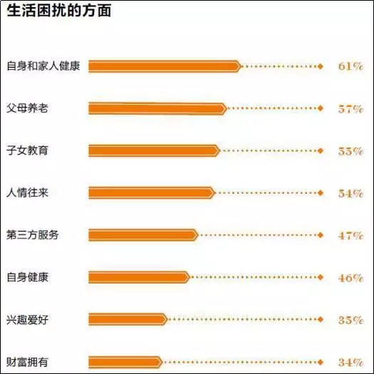 ● 在生活的困擾上,“自身及家人健康”以61%的選擇率排名第一,其次為“父母養老”(57%)和“子女教育”(55%);