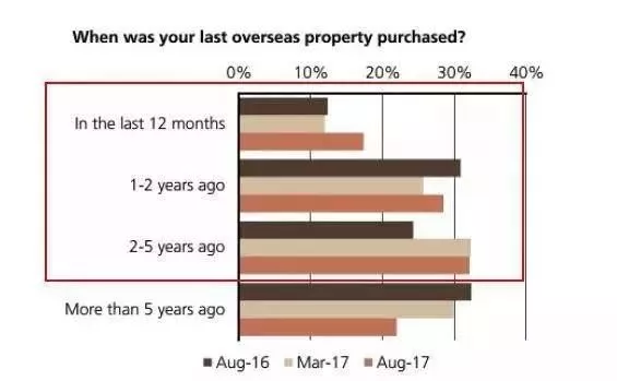 瑞銀財富(UBS)定期進行客戶調研,最近三次(分別是2016年8月、2017年3月、2017年8月)的調查結果顯示受訪的大陸投資者中,有18%的人是最近一年內(2016.8-2017.8)買房的,有78%的人是在過去的五年間(2012-2017年)買房的。其中有19%的購房房源還在建設當中,還未交付。