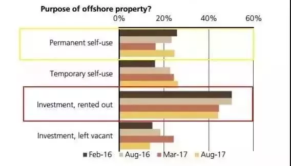 關于購買境外房產的理由,還是以投資為主,但是投資的占比有所下降(17年比16年下降5%左右),相反臨時居所的用途逐年增加。這也表明,大陸投資者的購房理念發生著轉變,越來越多的人有了“出去度假時有所居”的概念。