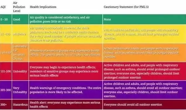 深棕色區域表示危險、紫色是非常不健康、紅色不健康、橙色代表對敏感群體不健康、黃色是一般、綠色是優秀,下表是對各個分類的具體描述: