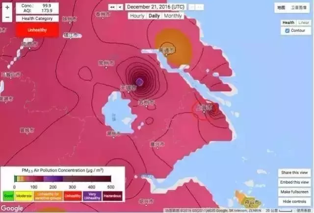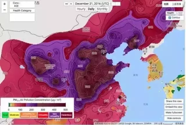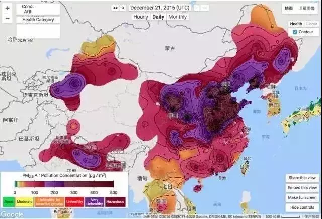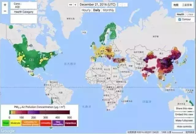 從下面第一張圖明顯可以看出,中國的大部分地區是空氣污染的重災區。