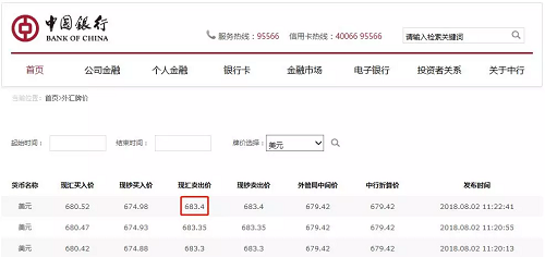 截止8月2日中午11點22分,中國銀行所公布的實時匯率,每100美元的現匯賣出價是人民幣683.4元。