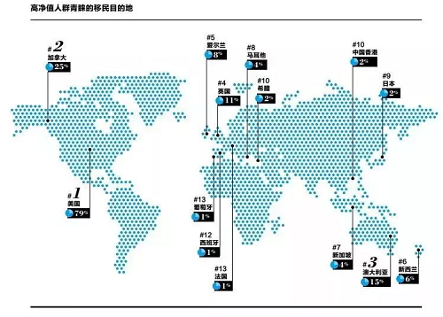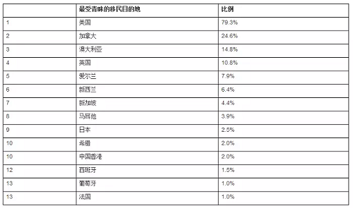 美國(guó)以79%蟬聯(lián)最受青睞的移民目的地榜首。其次是加拿大和澳大利亞,比例分別為25%和15%。