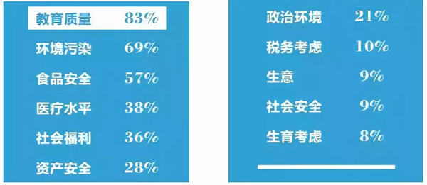 “教育質(zhì)量”依然是高凈值人群移民的最主要原因,選擇的比例達(dá)到83%,比去年又增加了7個(gè)百分點(diǎn)。其次是“環(huán)境污染”,選擇的比例為69%,比去年增加5個(gè)百分點(diǎn)。