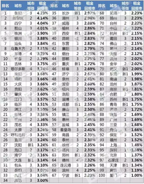 一般來說,5%以上的租金回報屬于適合投資的樓市。而目前,中國城市的租金回報率普遍比國外城市低。北上廣深僅為1.5%左右,排名第一的衡陽也僅有4.23%。