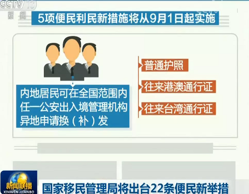 其中,內地居民可在全國范圍內異地申請換(補)發出入境證件、申辦出入境證件7個工作日內辦結等5項便利措施將于9月1日起施行。