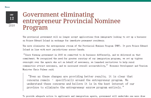 加拿大當地時間2018年9月12日上午,加拿大愛德華王子島省(P.E.I)政府宣布:關閉PEI PNP企業家移民計劃!
