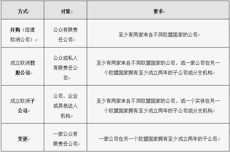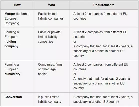 歐洲公司作為公眾有限責任公司具有法人資格。要建立一家歐洲公司,需滿足: