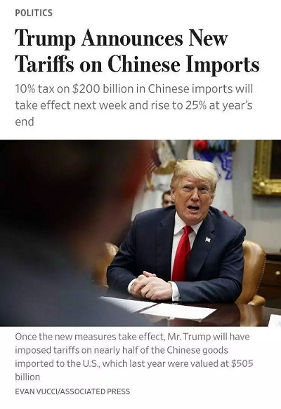 在此之前,美國已對價值500億美元的中國產品加征關稅。這意味著將近一半的中國對美出口產品很快將被加征關稅。