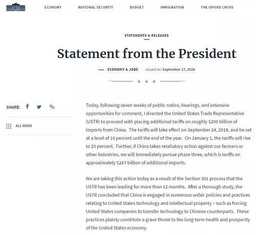 美國總統特朗普在美東時間周一下午股市休盤后正式宣布,對產自中國的2000億產品加征10%關稅,一周后的9月24日生效,這一稅率實行到年底。2019年1月1日起稅率將提高到25%。