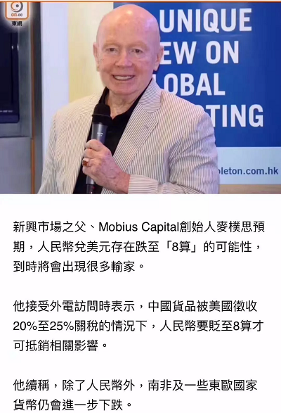 「新興市場之父」麥樸思認為,中美爆發貿易戰下,人民幣兌每美元匯價跌至8算并非沒有可能,意味較現時貶值近15%。
