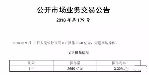 9月17日,開展2650億元1年期MLF操作,利率持平于3.30%