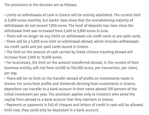 近日,希臘政府在《政府公報》公布放寬資本管制的決定,并從即日起生效。對希臘儲戶在海外提現的放寬措施將從10月1日起正式生效。