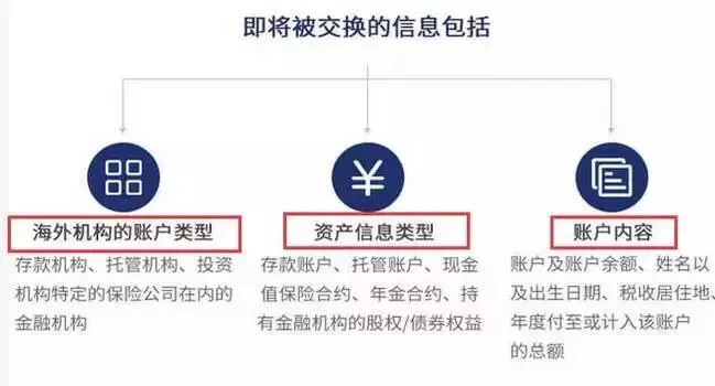 所有在海外開戶的中國稅務(wù)居民的基本信息,比如姓名,身份證號碼,住址,生日,賬戶號碼,賬戶余額還有每年出現(xiàn)的重大交易,另外還有銀行存款賬戶、托管賬戶、保險(xiǎn)合同等等信息都會(huì)和中國同步共享。