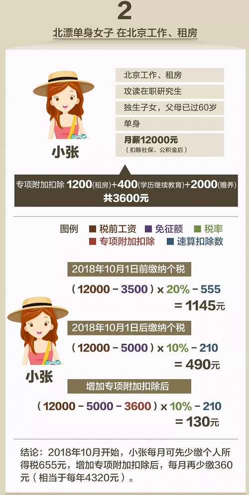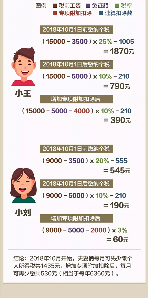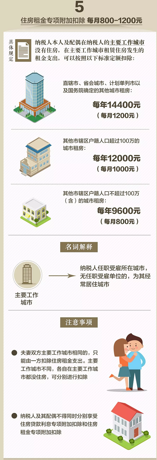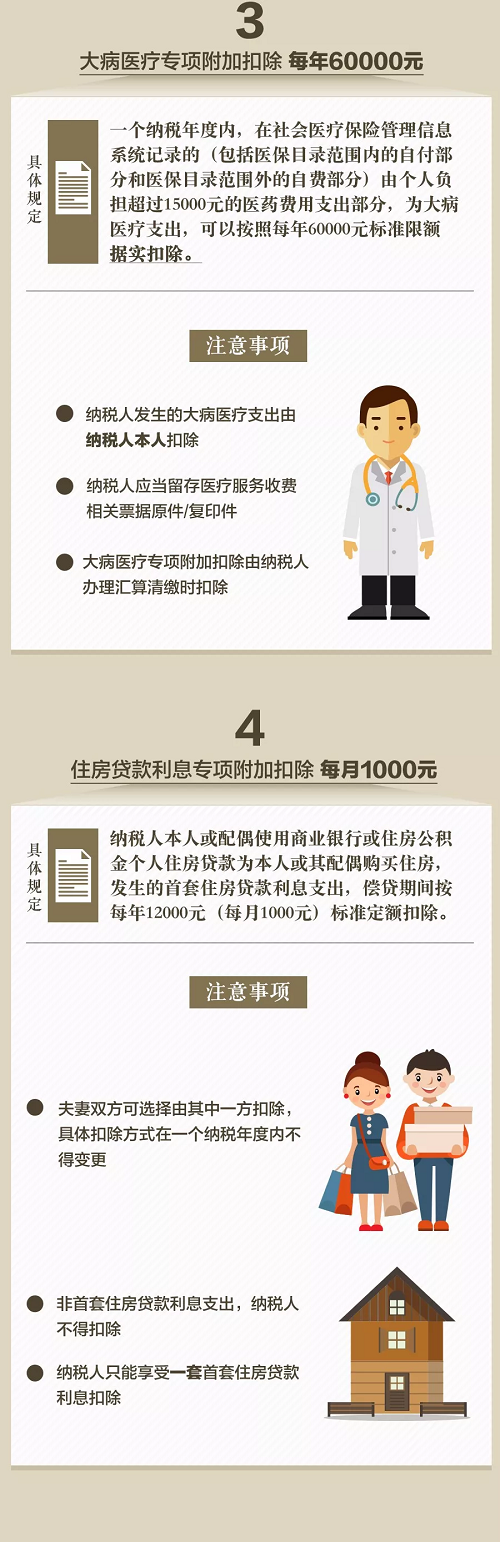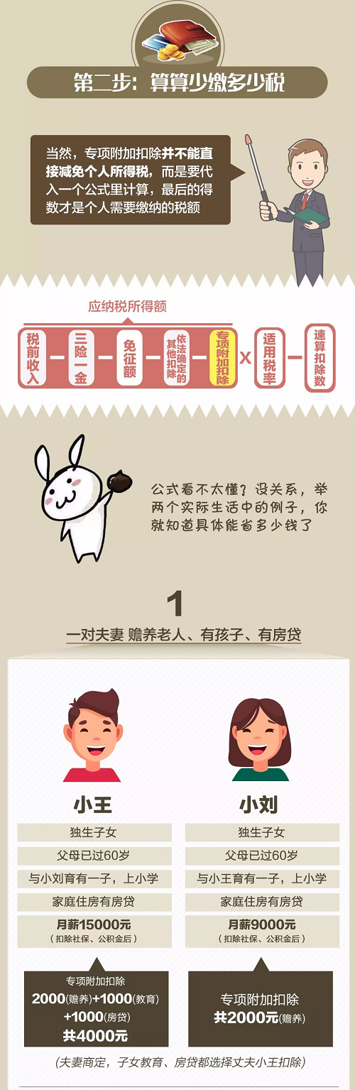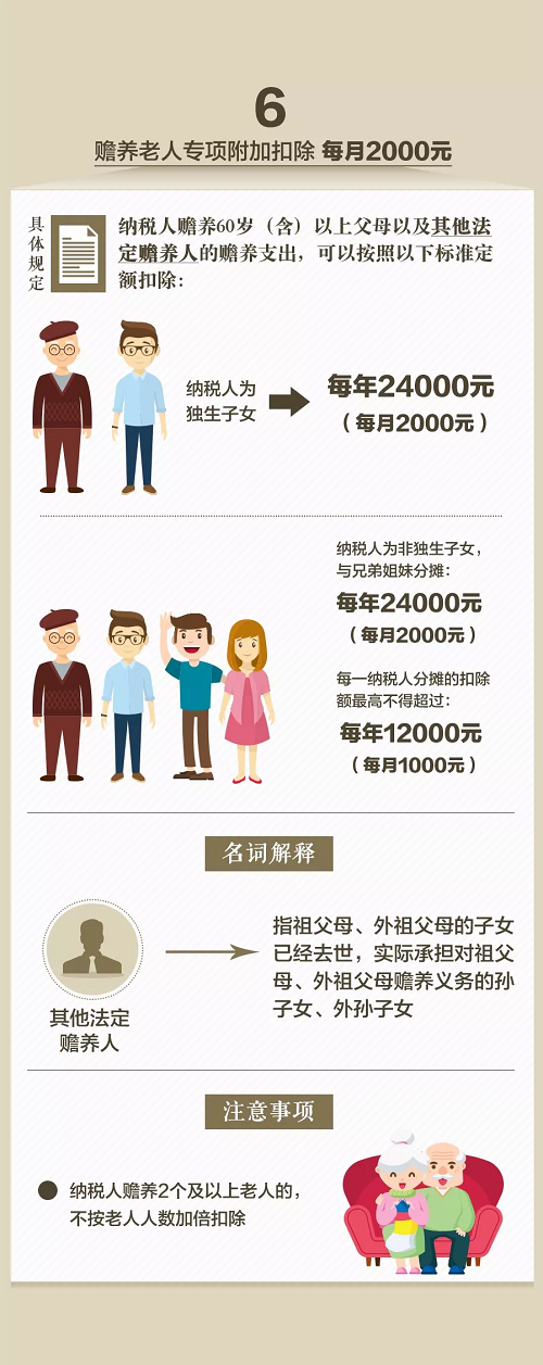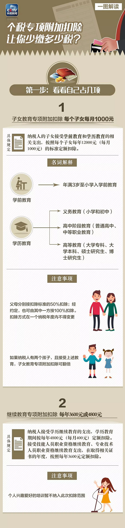 《暫行辦法》明確了個人所得稅法規定的子女教育、繼續教育等6項專項附加扣除的具體實施辦法。享受這些專項附加扣除,需要哪些條件?通過這些扣除項目,納稅人可以少繳多少個稅?跟隨下面這張圖,一起來算算。