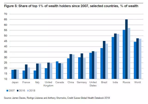 其中,中國家庭總財富已超過50萬億,緊跟美國之后,位居全球第二。但人均財富而言,瑞士人最富,個人平均財富達到53萬美元。與此同時,全球貧富差距形勢依然嚴峻,全世界一近半的財富握在1%的人手中。
