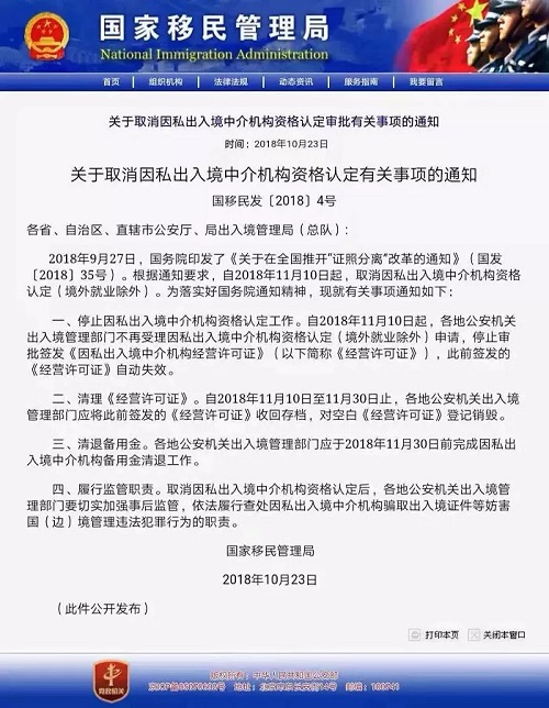 2018年10月23日晚,國家移民管理局發布關于取消因私出入境中介機構資格認定有關事項的通知: