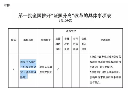 其實這項政策在前幾天國務院頒布的“證照分離”改革通知中就已有跡可循,此次國家移民管理局發布的取消因私出入境資質認定只是在踐行這一號召: