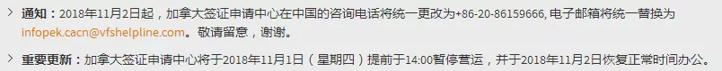 加拿大簽證中心官網(wǎng)的最新通知,自2018年11月2日起, 加拿大簽證申請(qǐng)中心在中國(guó)的咨詢電話以及電子郵箱地址將會(huì)進(jìn)行變更: