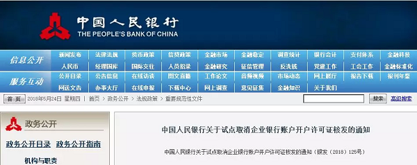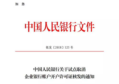 2018年5月23日,中國人民銀行發布了《關于試點取消企業銀行賬戶開戶許可證核發的通知》,經國務院批準同意,央行決定試點取消企業銀行賬戶開戶許可證核發,試點地區人民銀行分支機構對銀行為企業開立基本存款賬戶由核準制調整為備案制,不再核發基本存款賬戶開戶許可證。