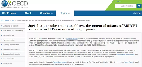10月22日,OECD稱各司法管轄區正在采取進一步行動,通過建立信息交換機制來防止賬戶持有人濫用RBI / CBI計劃。
