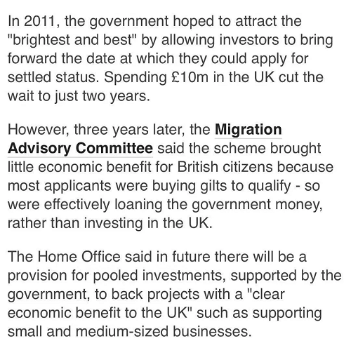 這個簽證計劃最初于2008年引入,鼓勵富人到英國投資,為其在英國定居提供一條快速通道。移民咨詢委員會表示:此前該計劃給英國帶來的效益微乎其微,因為大多數(shù)申請者購買英國國債僅僅是為了獲得資格。
