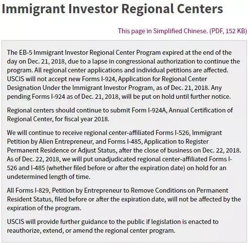 自2018年12月21日起,移民局不接受新的 I-924申請,已遞交尚未批準的I-924申請將暫停審理。 I-924申請,即投資移民試點計劃的區域中心申請將終止審理。