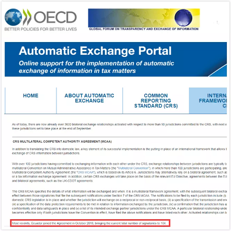 根據(jù)經(jīng)合組織(OECD)官方網(wǎng)站最新消息,目前CRS多邊主管當局協(xié)議(MCAA)簽署國總數(shù)達到104個!截至2018年12月,已經(jīng)有超過3600個(2018年8月,為3200個)雙邊交換關系被激活,這些關系涉及致力于CRS的90多個司法管轄區(qū)。隨著司法管轄區(qū)為2019年實操積極準備,預計未來幾個月將進一步激活。