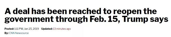 參議院民主黨領袖查克舒默正在與白宮就最終協議進行會議談判。由于本次政府重新啟動是臨時,立法者將有三個星期的時間達成協議,解決川普的邊境墻資金申請。如果在這三周內沒有達成協議,川普可能會引發國家緊急狀態。