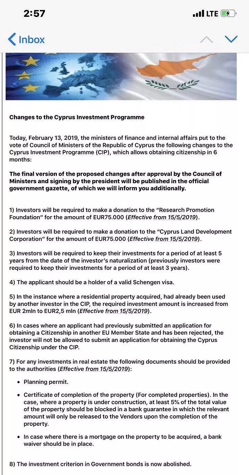 塞浦路斯內閣周三(2.13日)批準了財政部長提交的“投資公民身份計劃”的修改意見。修改意見主要包含以下要點: