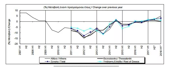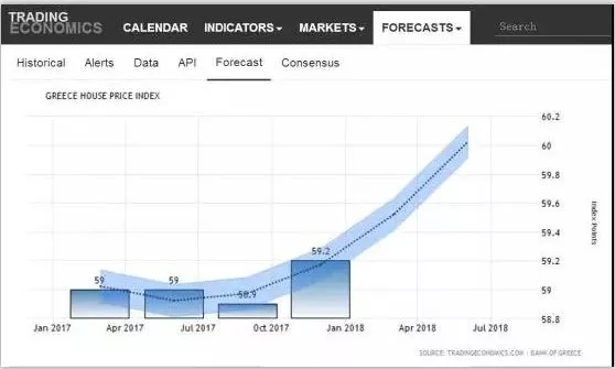 據(jù)權(quán)威機構(gòu)Trading Economics對希臘2018年房產(chǎn)價格指數(shù)的預(yù)估(圖1)顯示,希臘的房價指數(shù)將保持持續(xù)上升的狀態(tài)。通過與2018年上半年房價指數(shù)實際增長數(shù)據(jù)(圖2)對比可知,2018年的實際房產(chǎn)價格指數(shù)是高于預(yù)估的,并且同樣保持持續(xù)上升的趨勢。