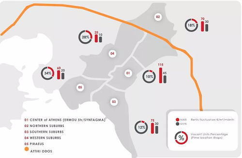 2017年-2018年雅典市中心的商鋪需求得到很大的回升,位于市中心和富人區(qū)商業(yè)街的商鋪空置率低于10%。旺鋪的熱門區(qū)域中,愛莫街上的商鋪租金最高已經(jīng)漲到€150/m2/月,市中心的平均租金也已經(jīng)漲到最高€115/m2/月,最低€45/m2/月成為雅典最受歡迎的商鋪租客首選地。